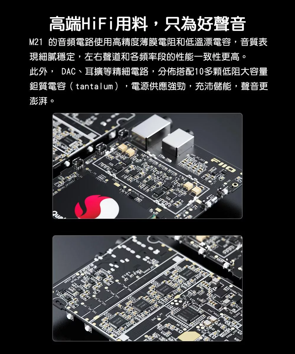 M21的音頻電路使用高精度薄膜電阻和低溫漂電容,音質表現細膩穩定,左右聲道和各頻率段的性能一致性更高。此外,DAC、耳擴等精細電路,分佈搭配10多顆低阻大容量鉭質電容(tantalum),電源供應強勁,充沛儲能,聲音更澎湃。