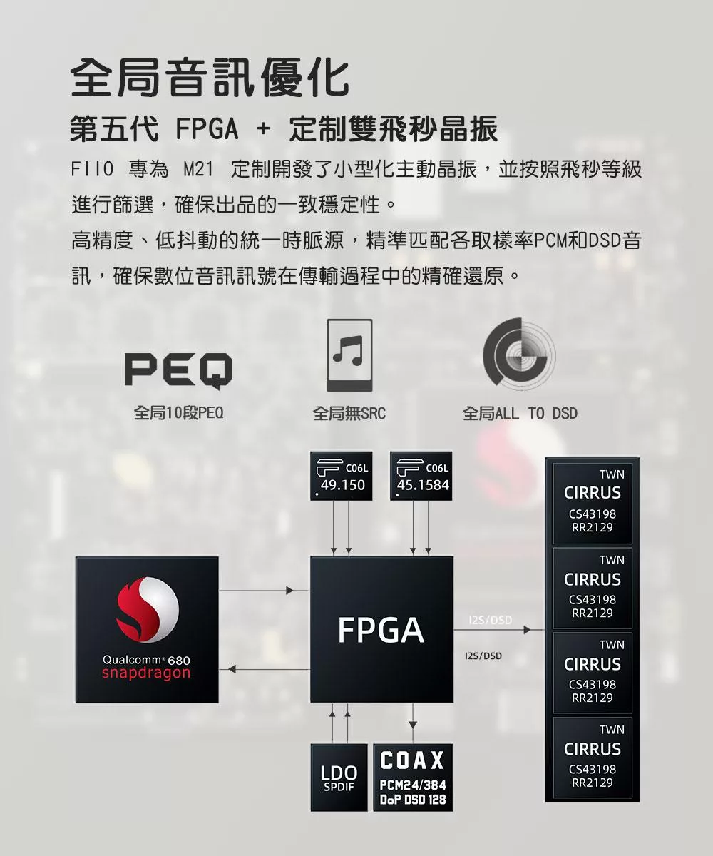 全局音訊優化,第五代 FPGA + 定制雙飛秒晶振|