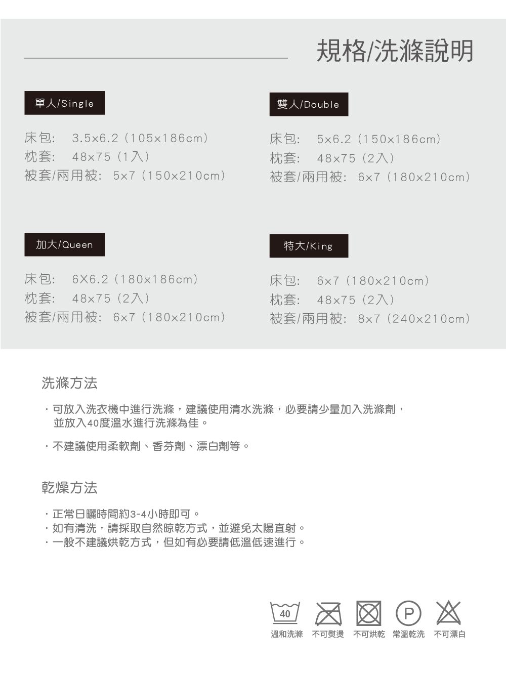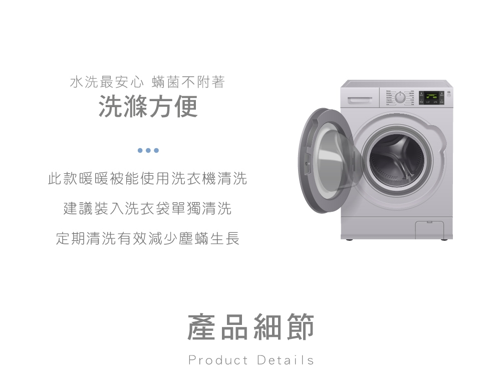 .建議清洗時,先將洗劑溶解於水中,再將床寢放入大型洗衣袋後再清洗。