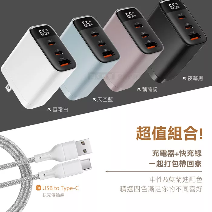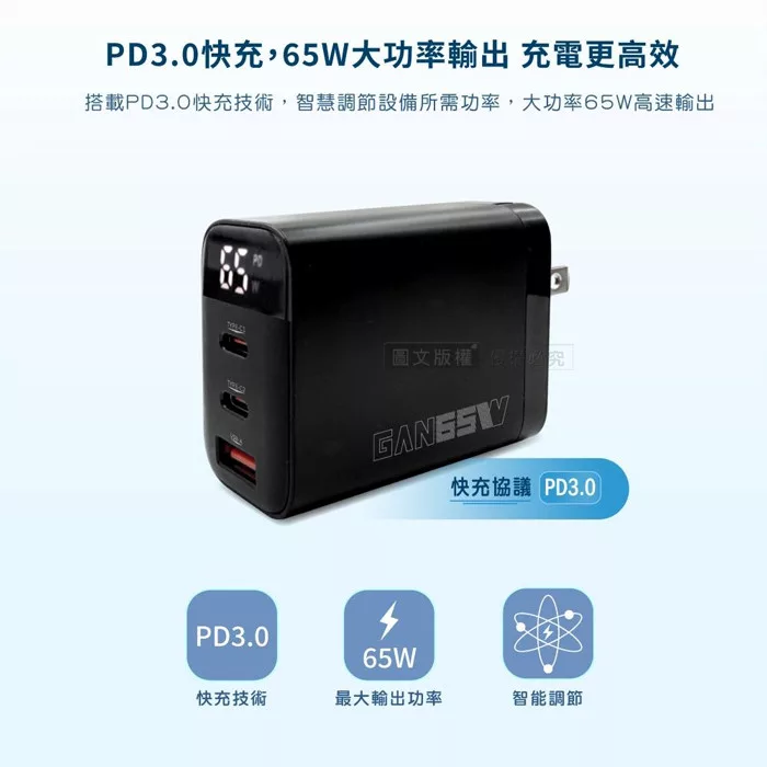 | 氮化鎵黑科技,輕巧高效,快速充電 支援3台裝置同時快充,PD3.0快充 智能數顯,顯示充電功率,最大功率65W 多重安全防護+摺疊插角│3.4A大電流,快速充電體驗 |