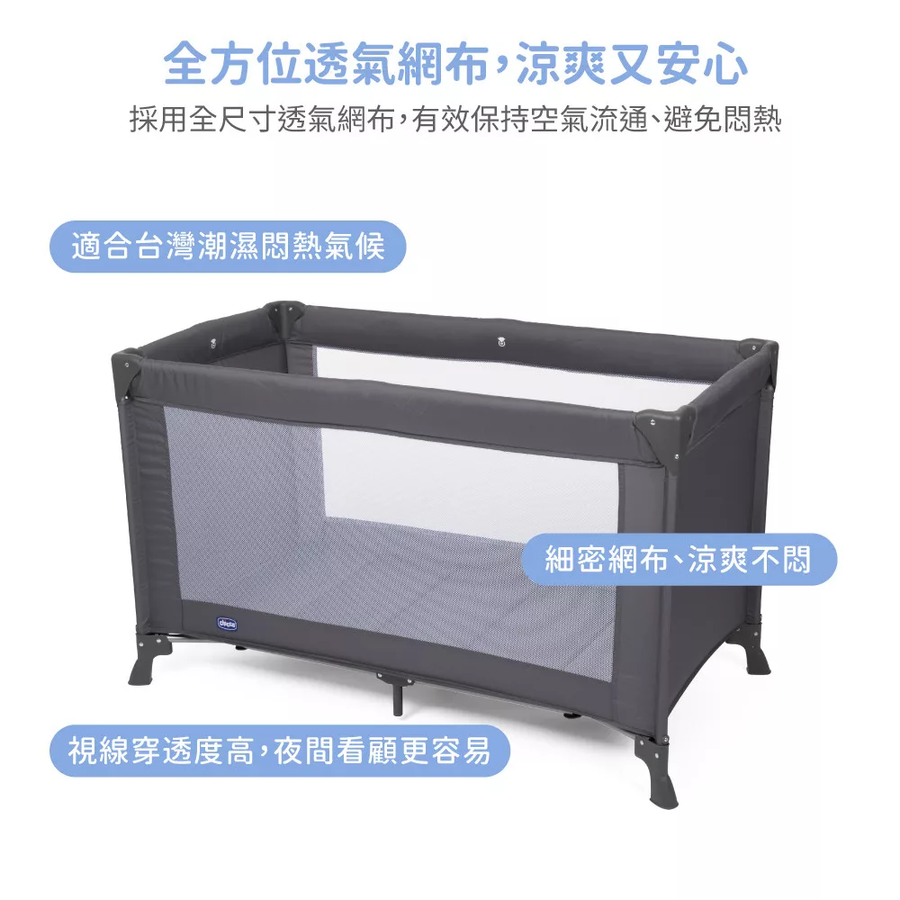 ●全方位透氣網布 兩側細密網布窗,保持空氣流通。 寶寶睡覺時視線可見,爸媽可安心照看。