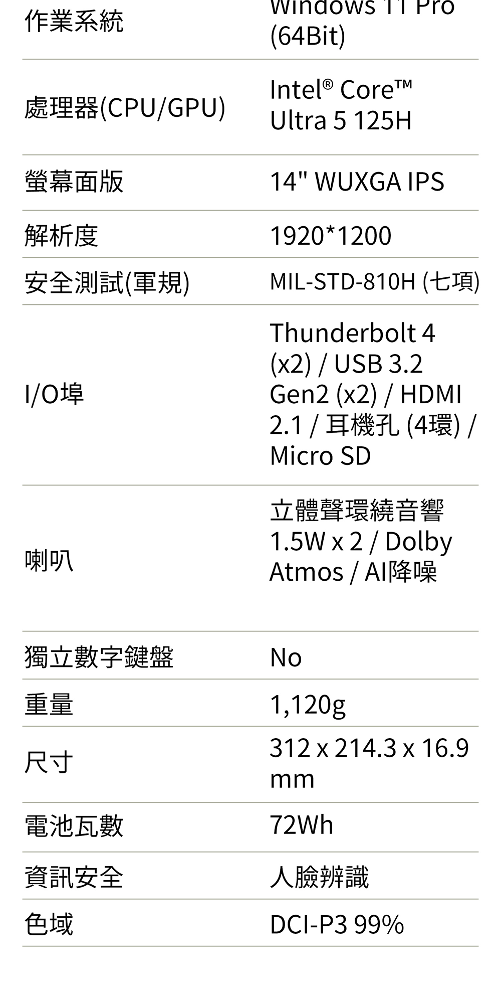 | I/O埠 | Thunderbolt™ 4 (x2) / USB 3.2 Gen 2 (x2) / HDMI 2.1/ 耳機孔(4環)/Micro SD |