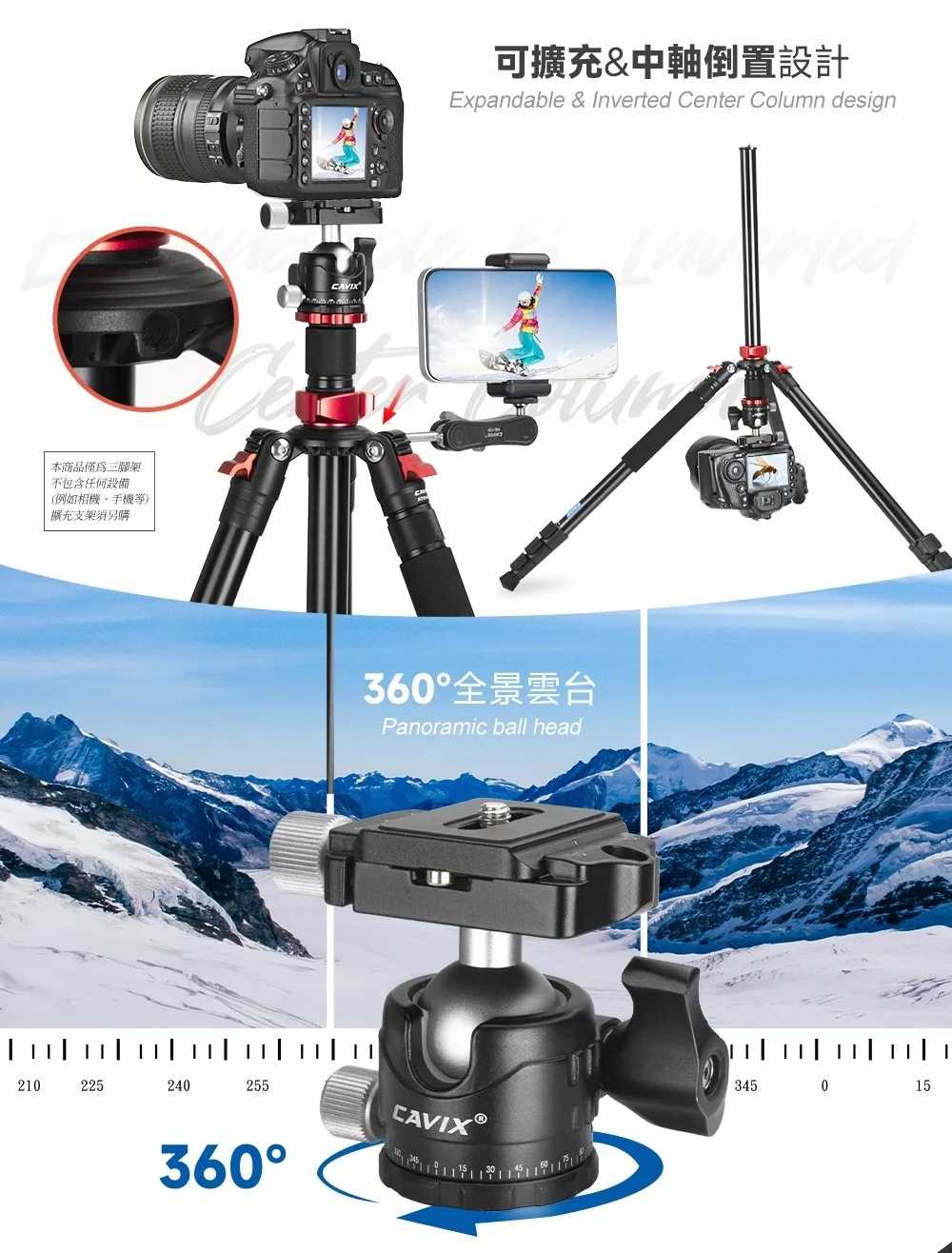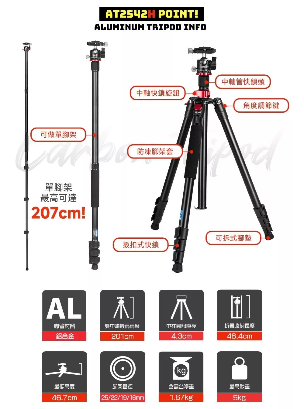 CAVIX 凱唯斯 AT-2542H 旅行鋁合金反折腳架套組(特高版)