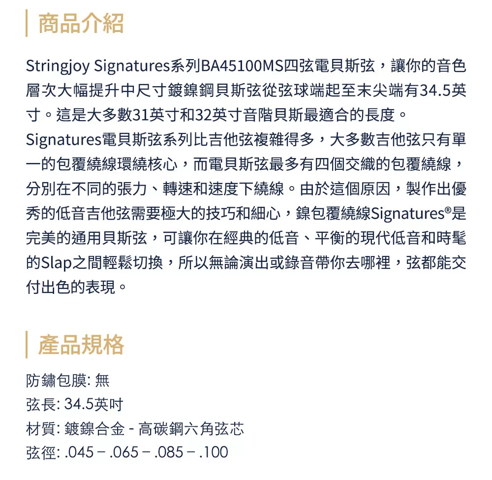 【Stringjoy】45-100 四弦電貝斯套弦 BA45100MS 公司貨