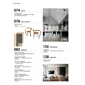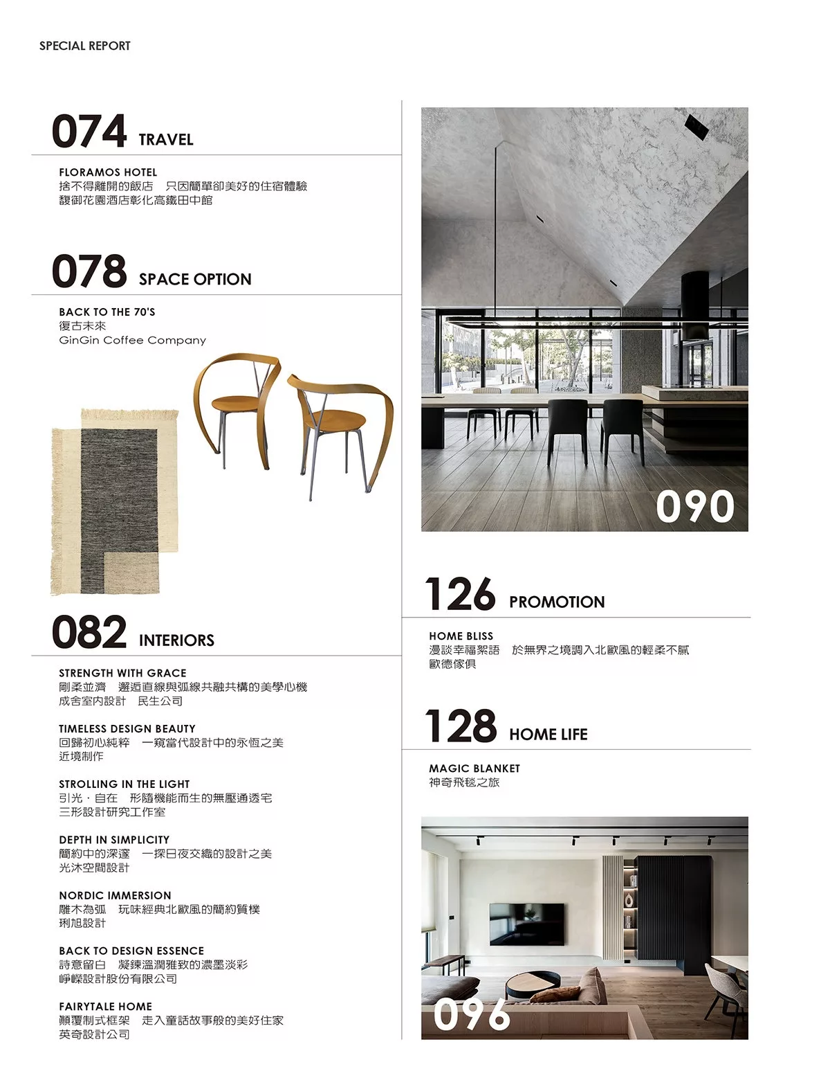 除了設計案與展覽之外,我們也報導了國內一些獨特的物與人,例如位居彰化的馥御花園酒店,這一座融合現代風格與在地文化的新落成建築,將成為旅人們心中的璀璨亮點,開箱介紹有其必要性;抑或是新開幕的GinGin Coffee 忠孝本店,店內陳列眾多經典家具,讓人流連忘返;還有特別採訪了大禧堂做創意的莊禧善總監,這一位以打造星宇航空企業識別設計而廣受矚目的創意人,不僅擁有豐富的專業背景,更透過他獨特的人生故事深刻啟發大眾對於設計的反思與熱情。