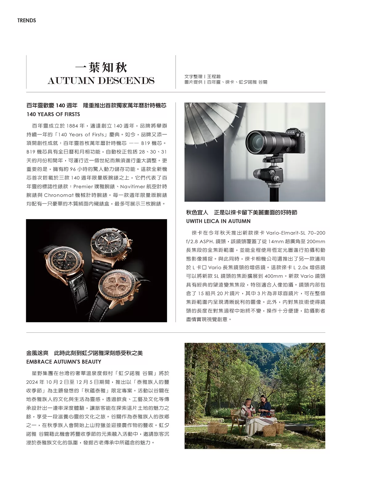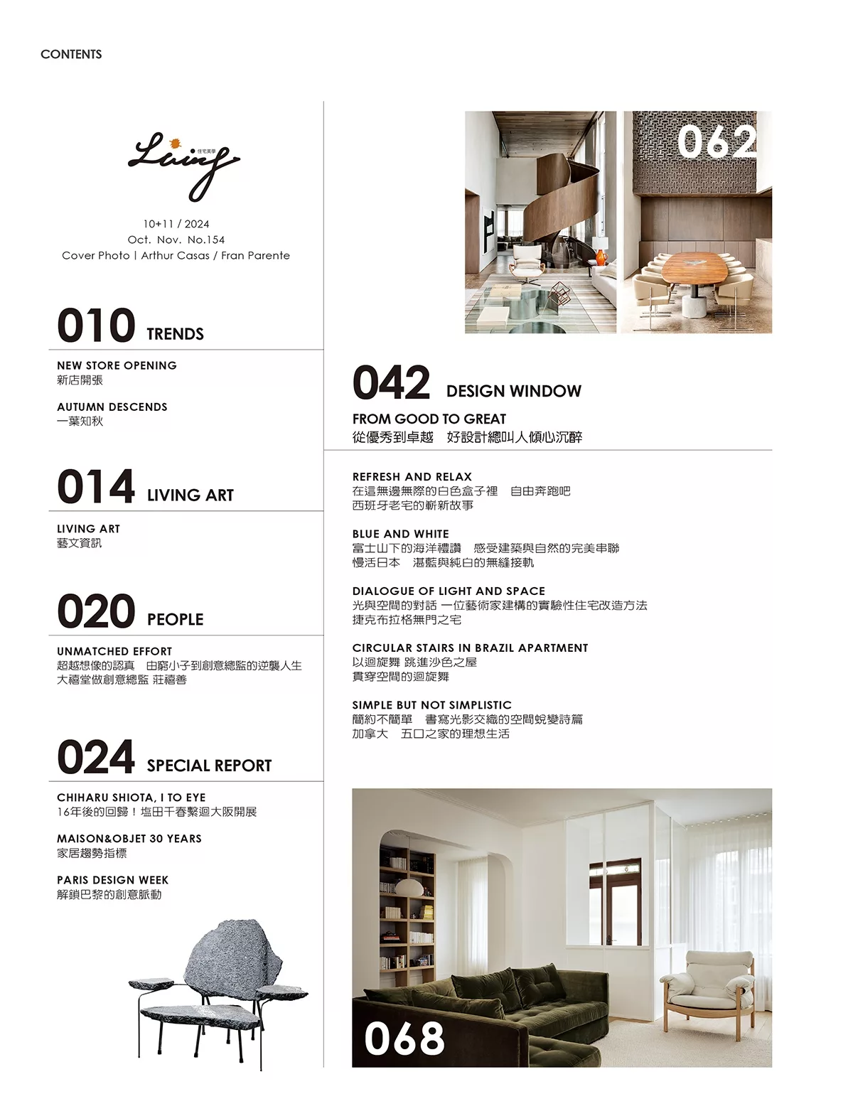 簡而言之,本期雜誌無疑是一場關於美的對話,跨越了設計、文化與人性的邊界。我們希望透過這些精挑細選的內容,能夠為讀者帶來多元且豐富的靈感,並在日常生活中發現更多專屬於你的美麗風景。