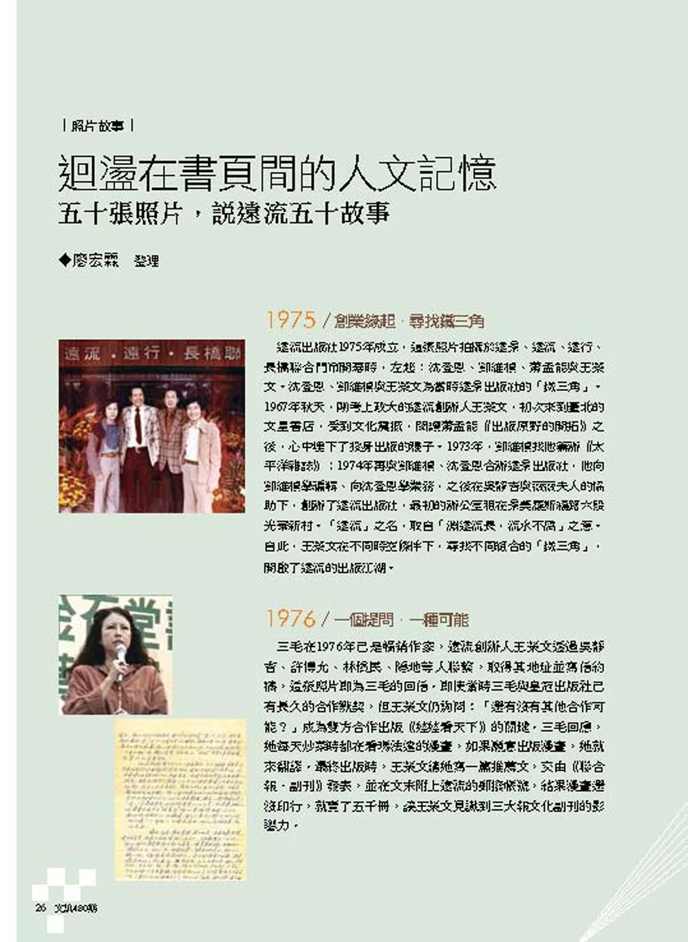 五十年的出版長路,遠流始終以好作家、好作品承載時代與人心。以文字與圖像的觸動、思想與閱讀的餘韻,融匯於大眾的五感經驗,為心靈開啟無數窗口,眺望知識的悠長脈流。本期將翻出遠流人壓箱寶的老照片,訴說書與人的故事,亦由作家IP、數位與合作出版等,探看產業背景與趨勢。不僅回顧歷史,更希望每位讀者深層地再感受、再記憶、再閱讀。