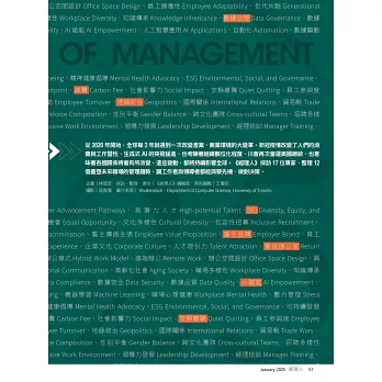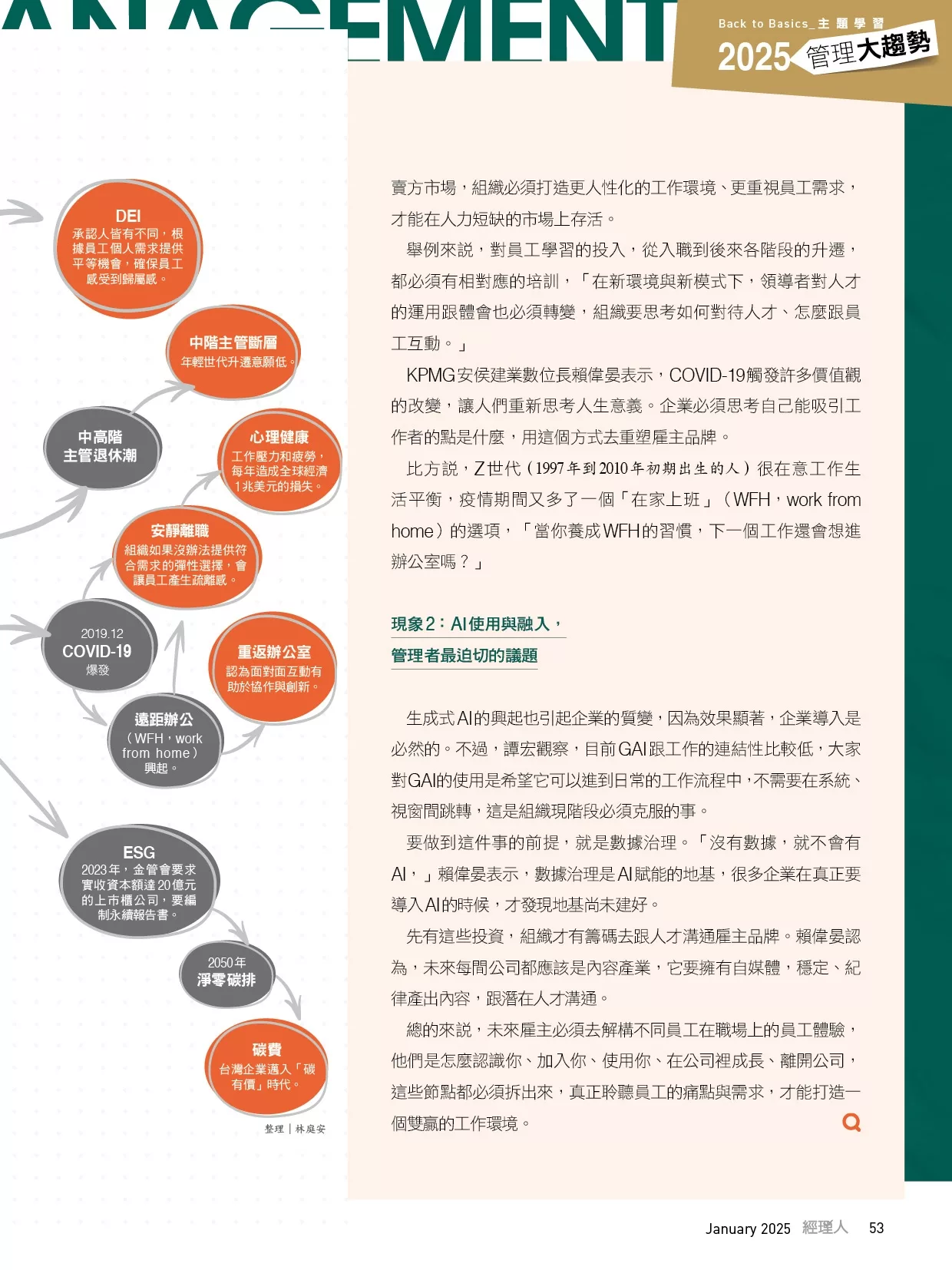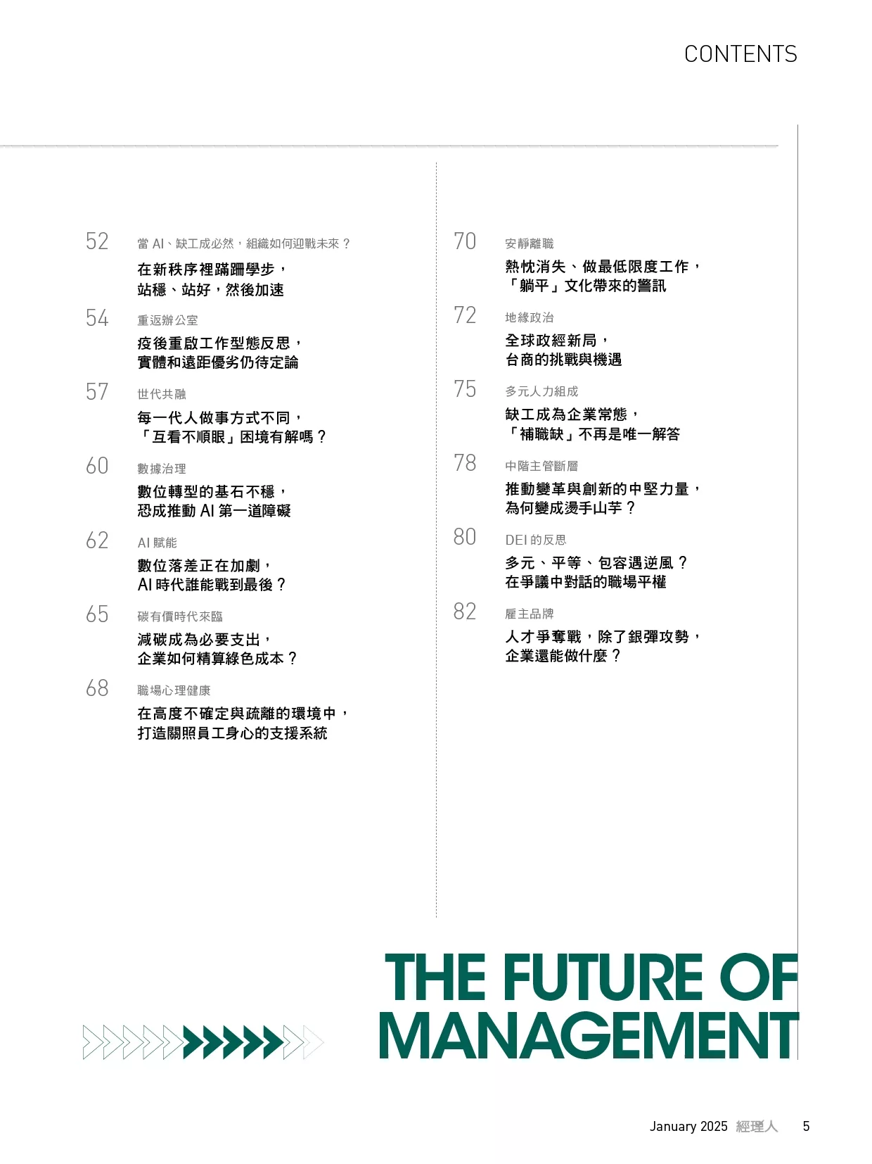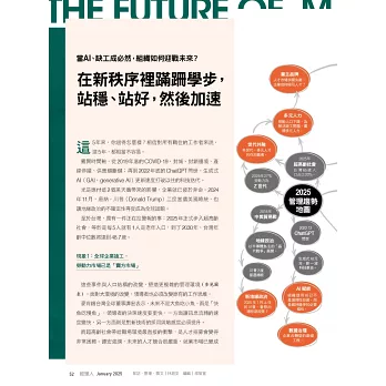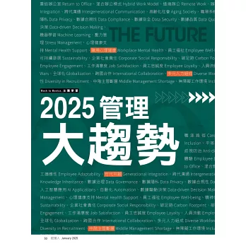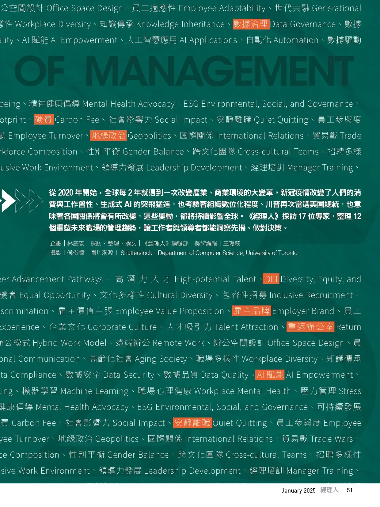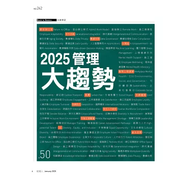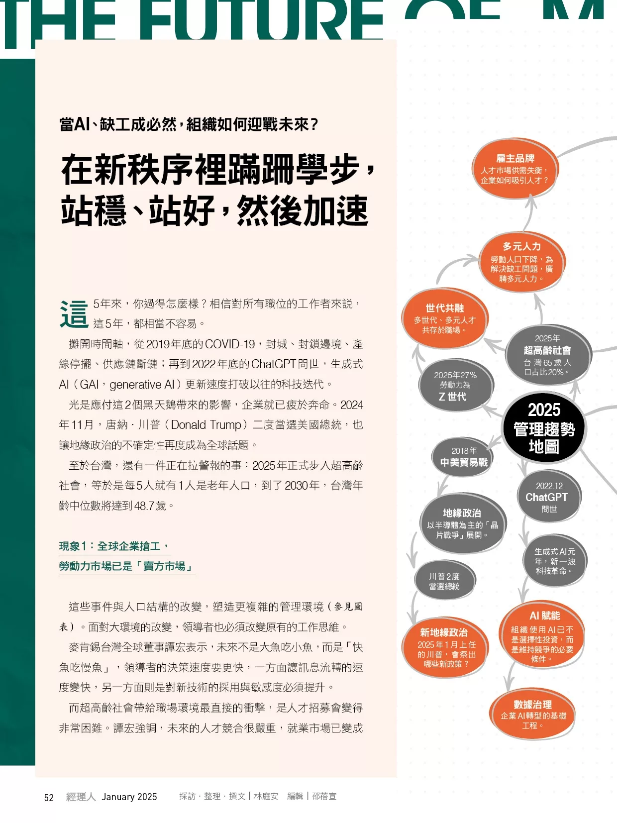 從2020年開始,全球每2年就遇到一次改變產業、商業環境的大變革。新冠疫情改變了人們的消費與工作習性、生成式AI的突飛猛進,也考驗著組織數位化程度、川普再次當選美國總統,也意味著各國關係將會有所改變,這些變動,都將持續影響全球。《經理人》採訪17位專家,整理12個重塑未來職場的管理趨勢,讓工作者與領導者都能洞察先機、做對決策。