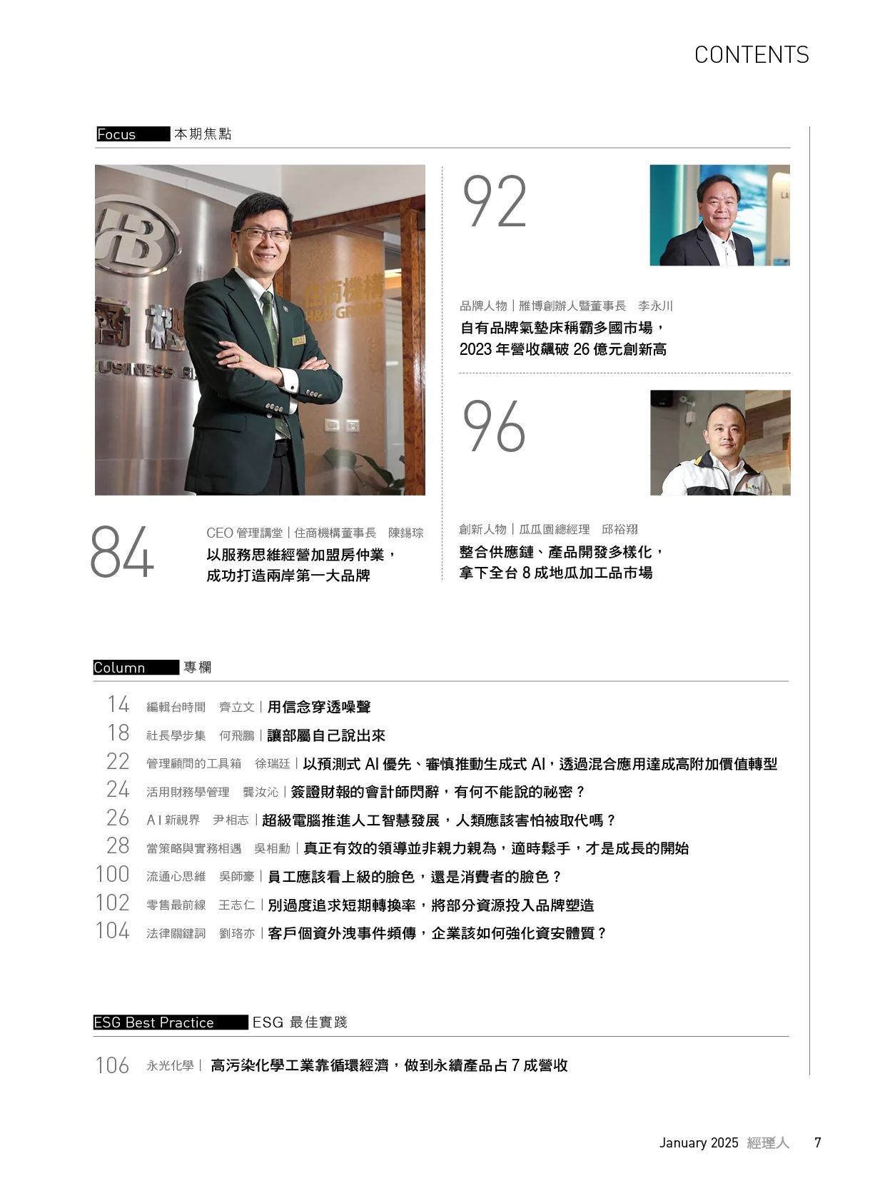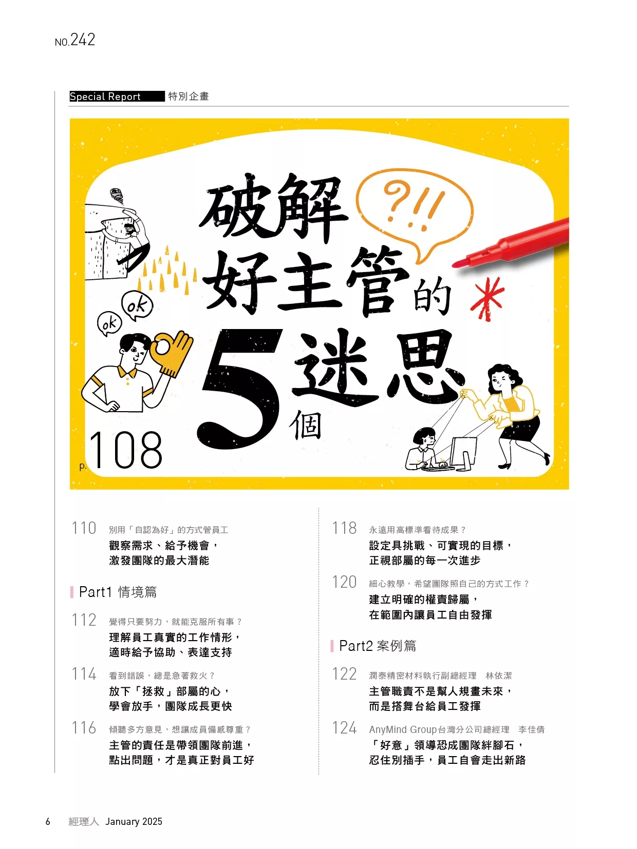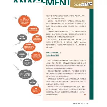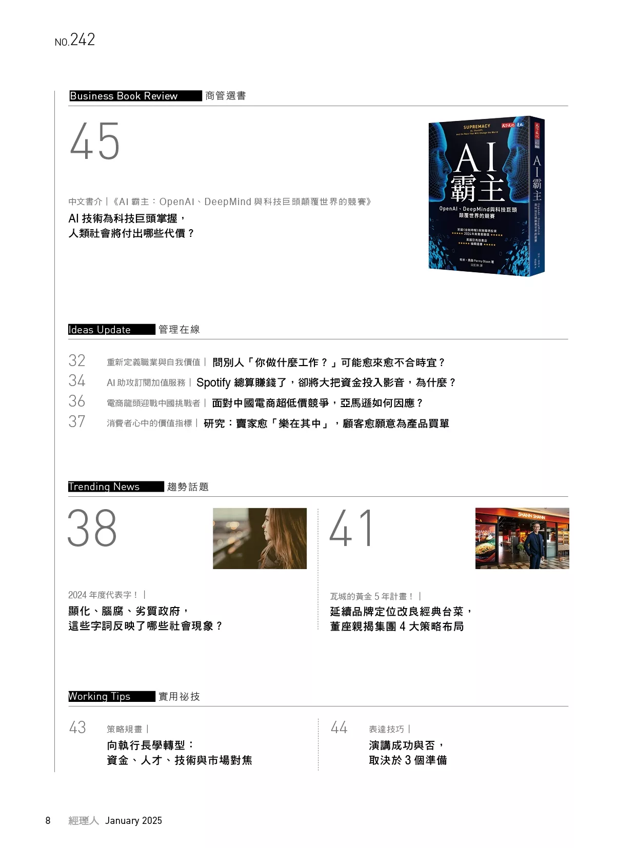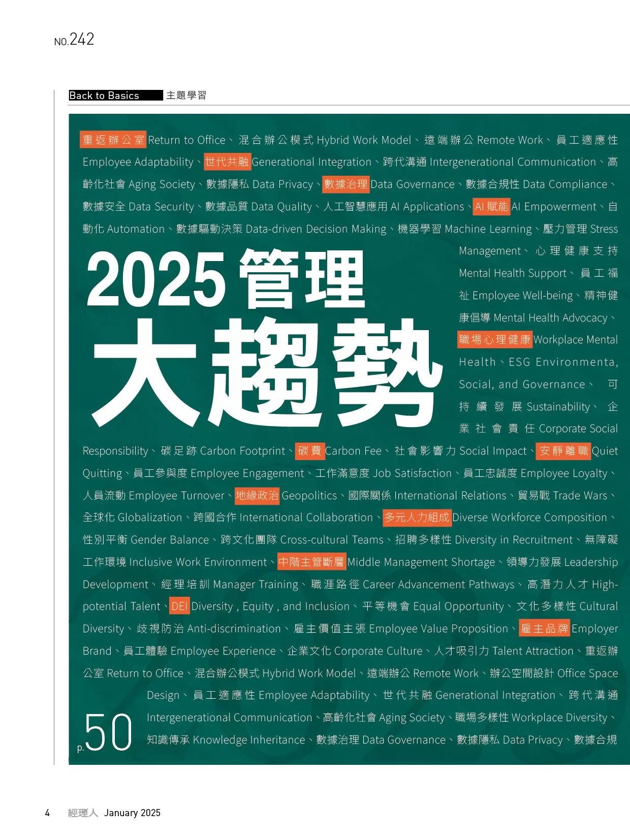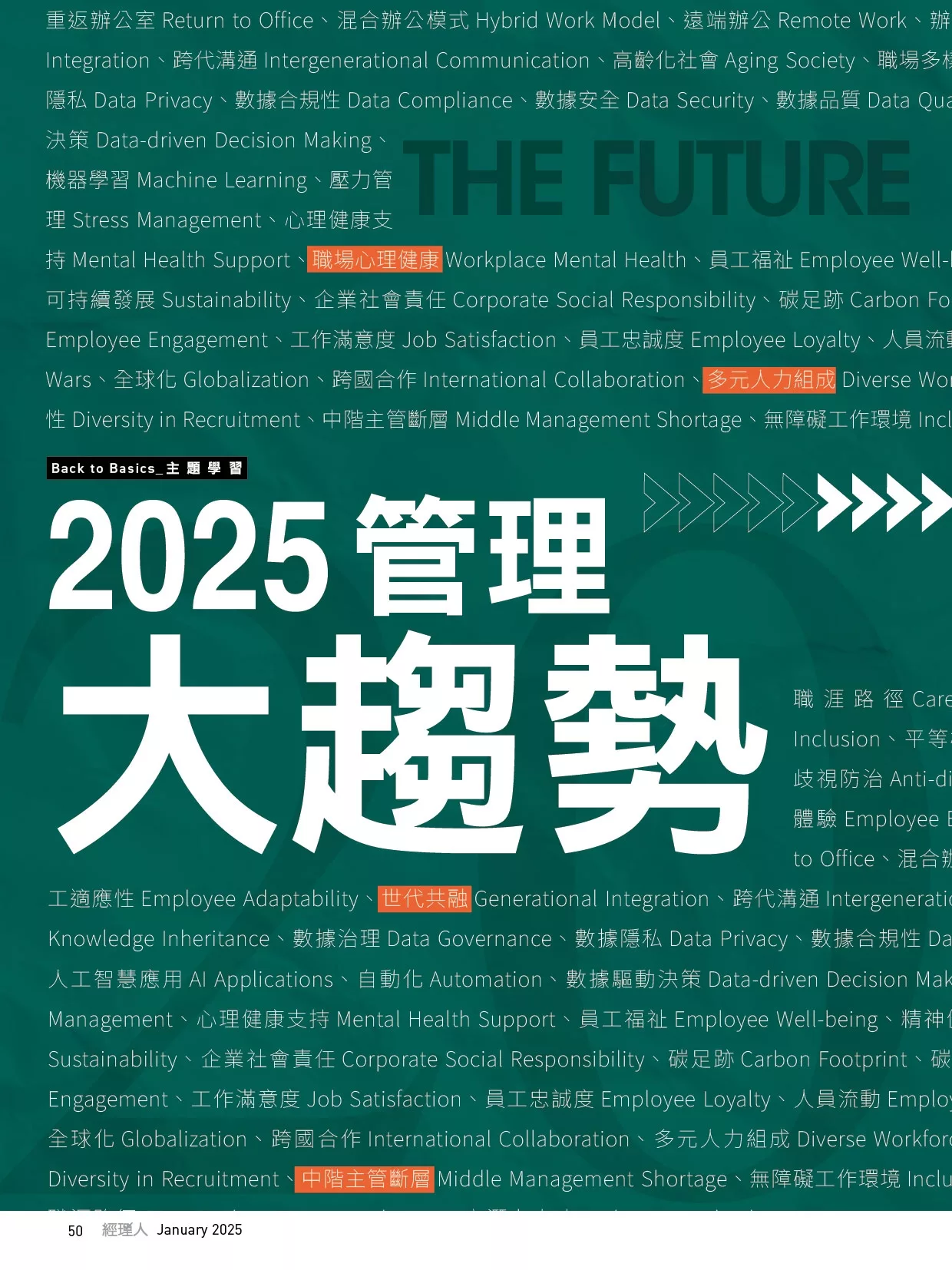 從2020年開始,全球每2年就遇到一次改變產業、商業環境的大變革。新冠疫情改變了人們的消費與工作習性、生成式AI的突飛猛進,也考驗著組織數位化程度、川普再次當選美國總統,也意味著各國關係將會有所改變,這些變動,都將持續影響全球。《經理人》採訪17位專家,整理12個重塑未來職場的管理趨勢,讓工作者與領導者都能洞察先機、做對決策。