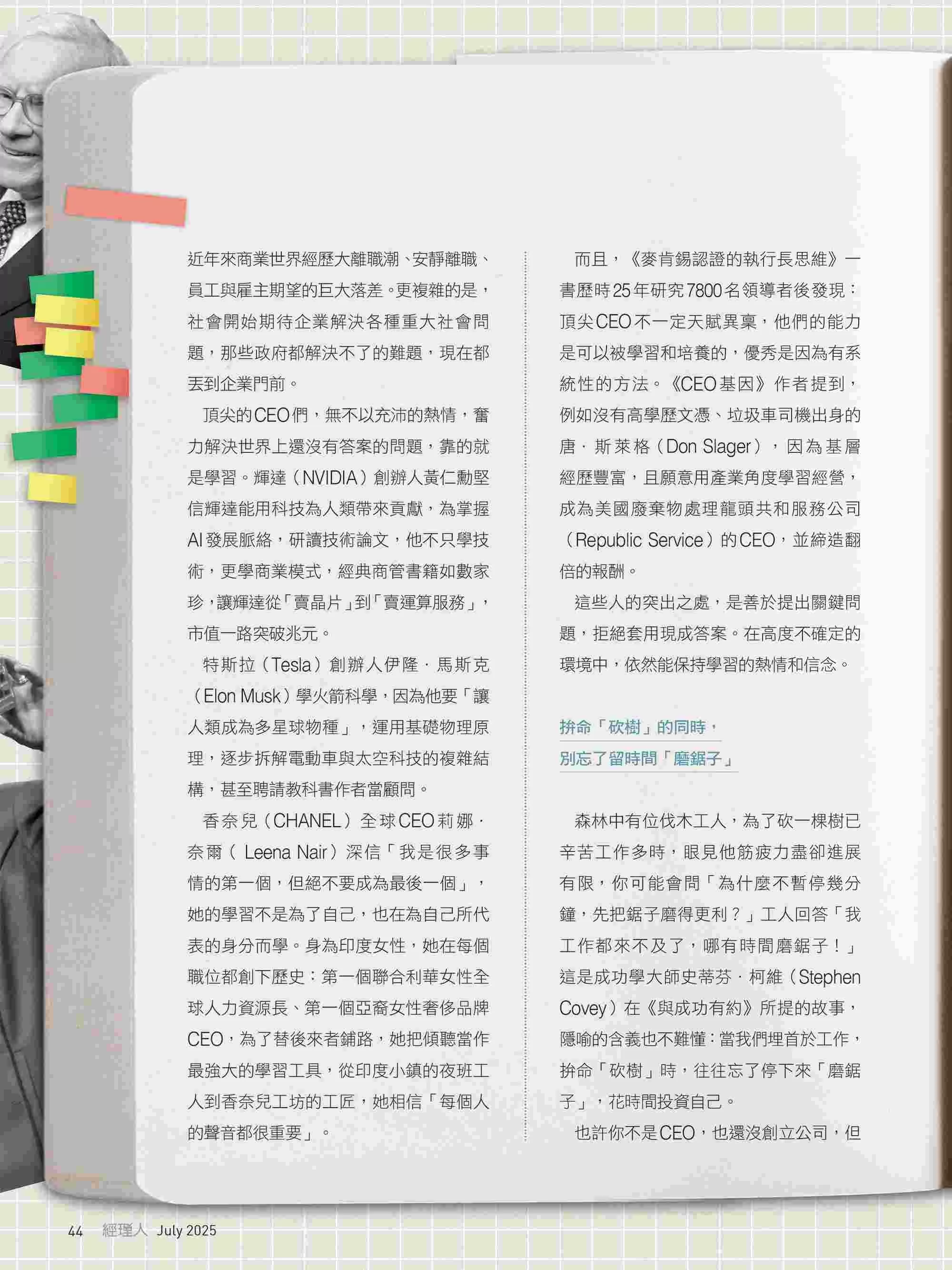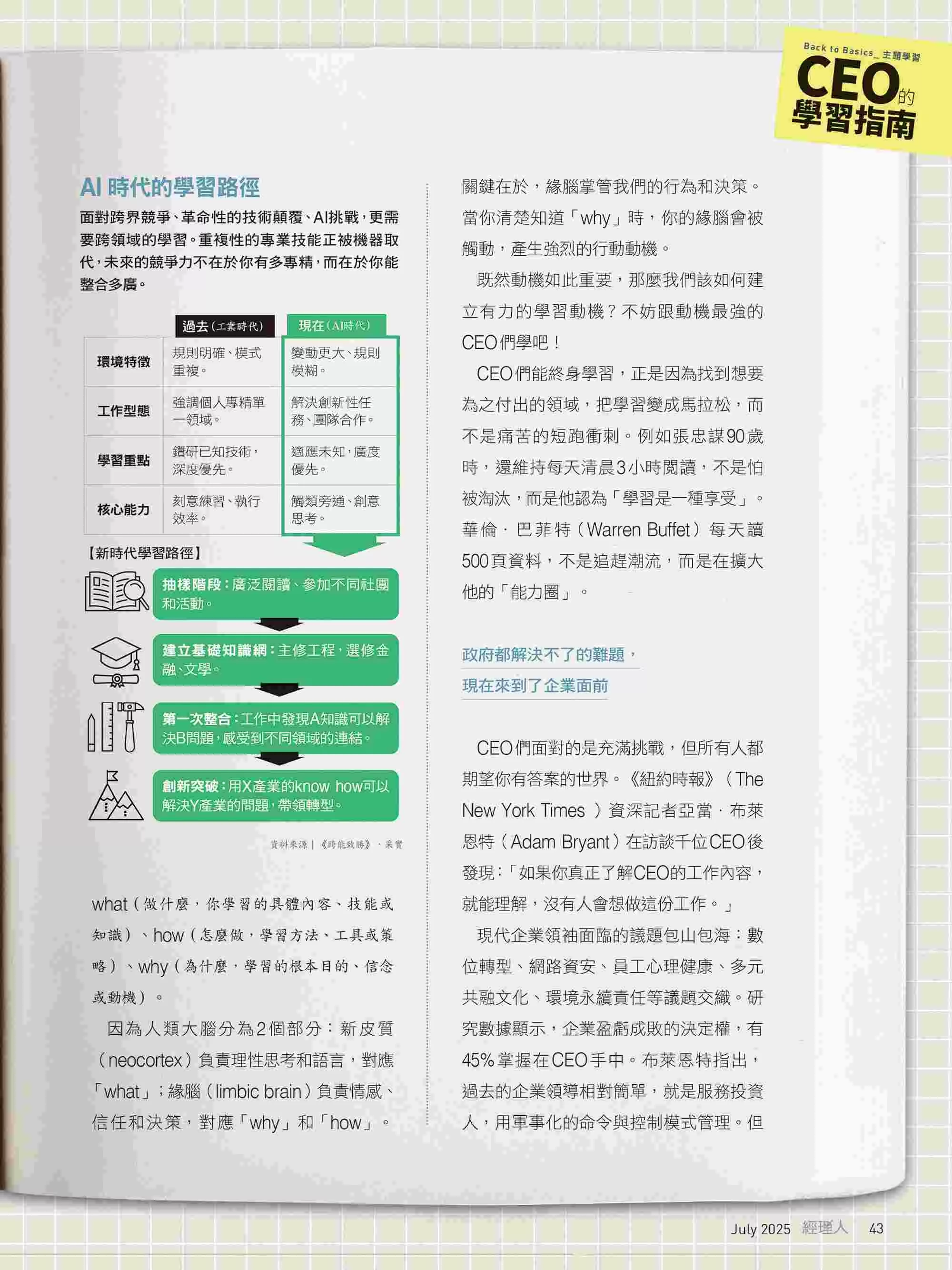 要做好你現在的工作,你該學什麼?就算你還沒有答案,你也一定感覺到了,世界變得比以往更快、更複雜,AI更加速顛覆了職場與產業。也許問題不是「該學什麼」,而是「如何不斷學習、自我更新?」這個問題,或能問世界頂尖的CEO們,因為他們是最早感受到變局與焦慮的人,也是最熱衷於學習的一群人。