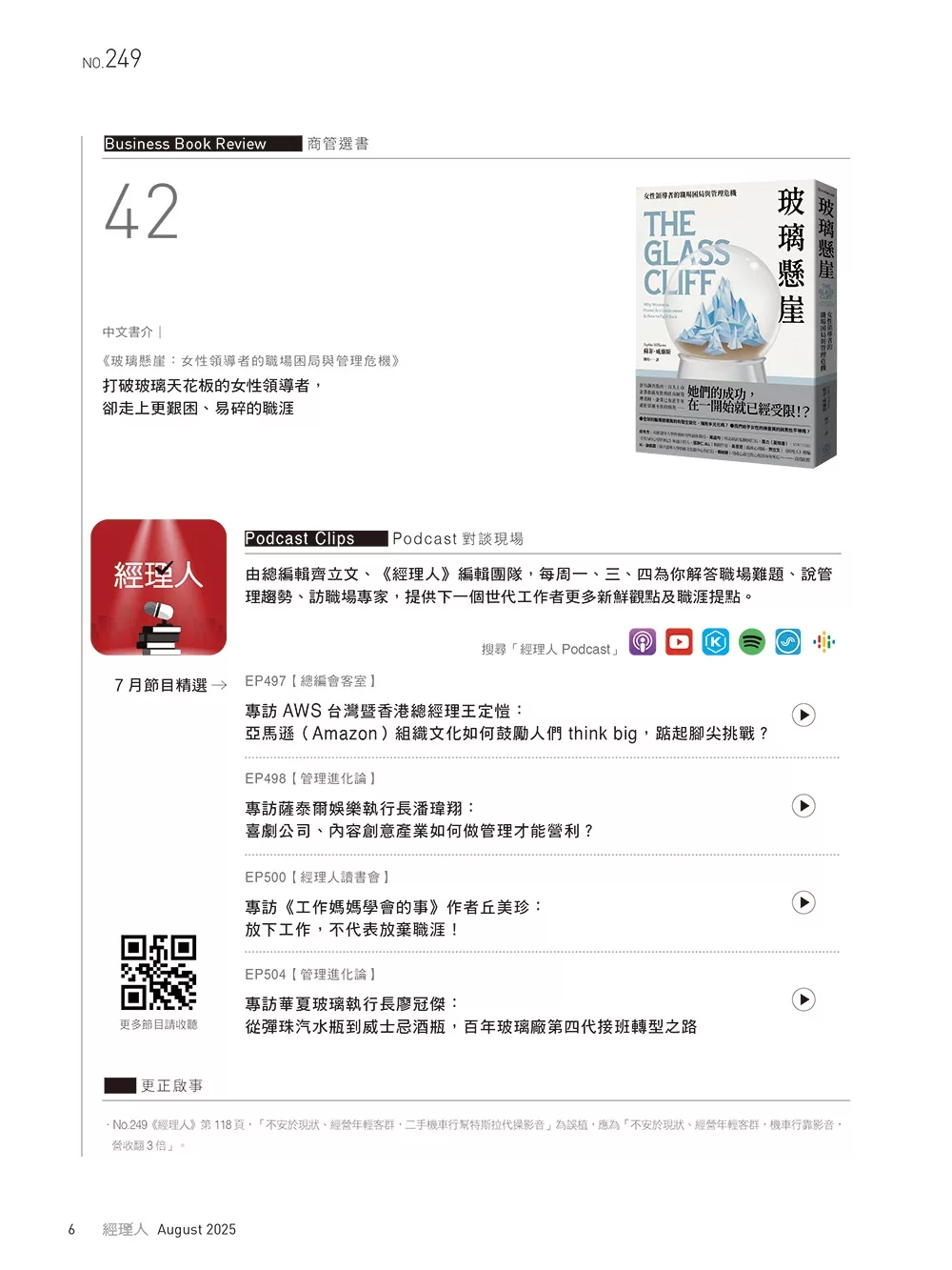 ・No.249《經理人》第118頁,「不安於現狀、經營年輕客群,二手機車行幫特斯拉代操影音」為誤植,應為「不安於現狀、經營年輕客群,機車行靠影音,營收翻3倍」。