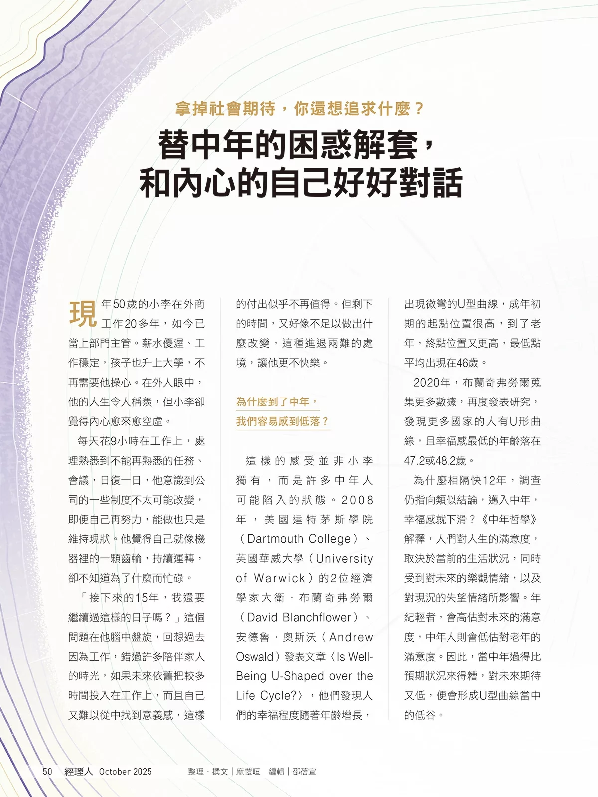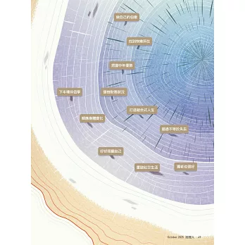 40〉這類封面故事為例,根據我們當下的年齡段,還有當時的內在狀態與外在條件,我們被激起的感覺可能是成就感,因為我和他們一樣年輕有為;可能是拚搏感,有為者亦若是;也可能是焦慮感,相近的年齡段,人家已經到那裡了,我卻還在這裡;說不定還會有自卑感、自我嫌惡感、絕望感⋯⋯我這輩子大概這樣了吧。