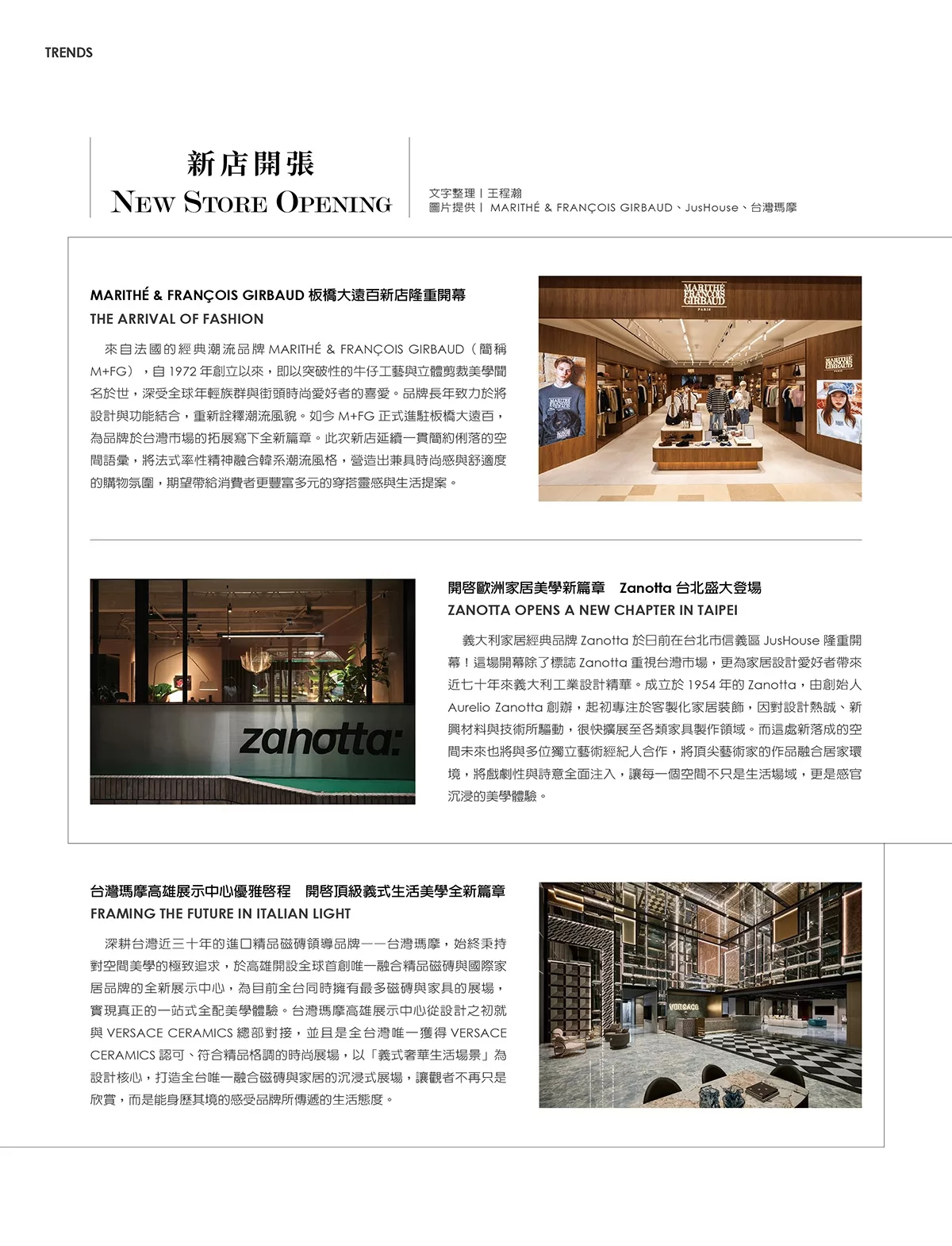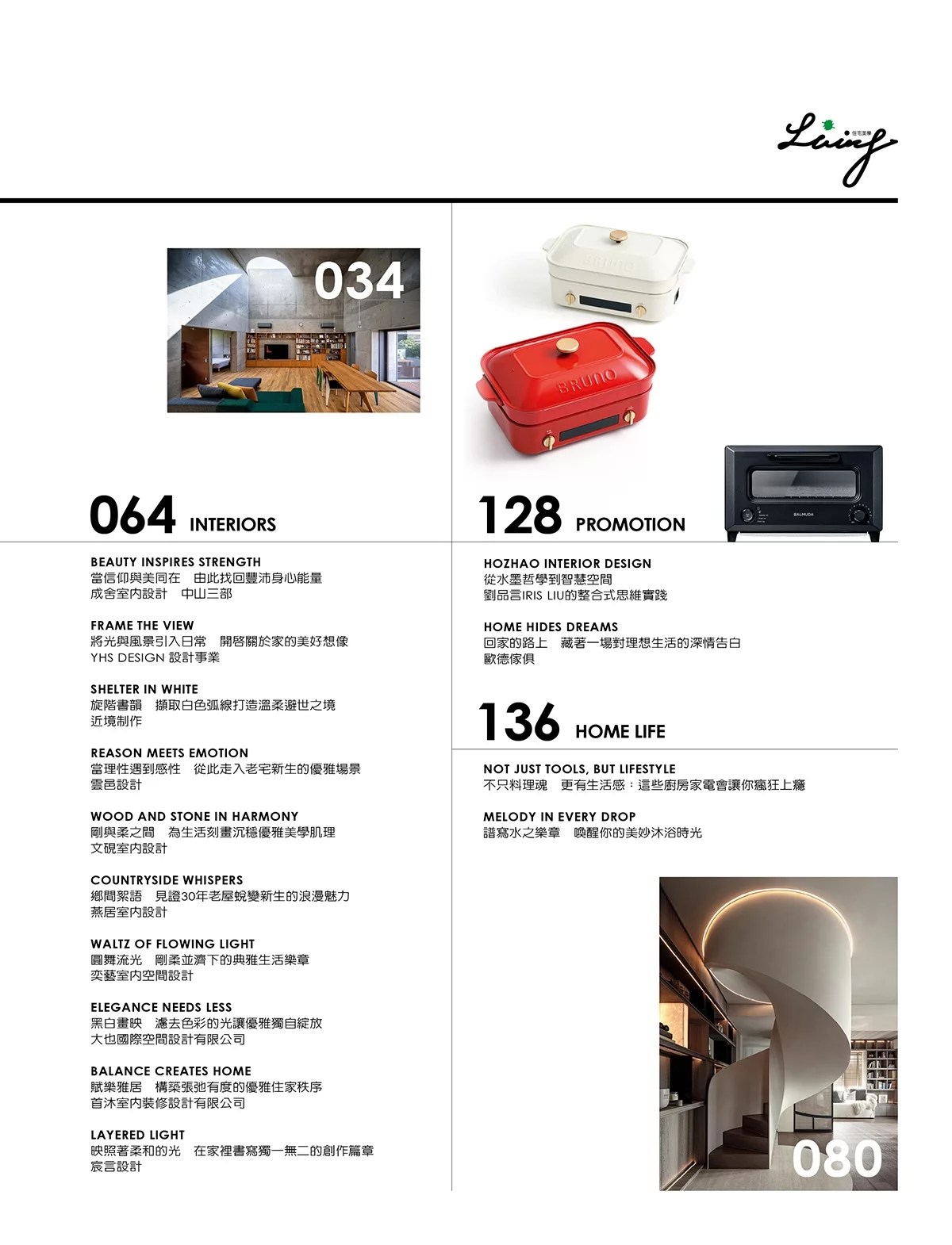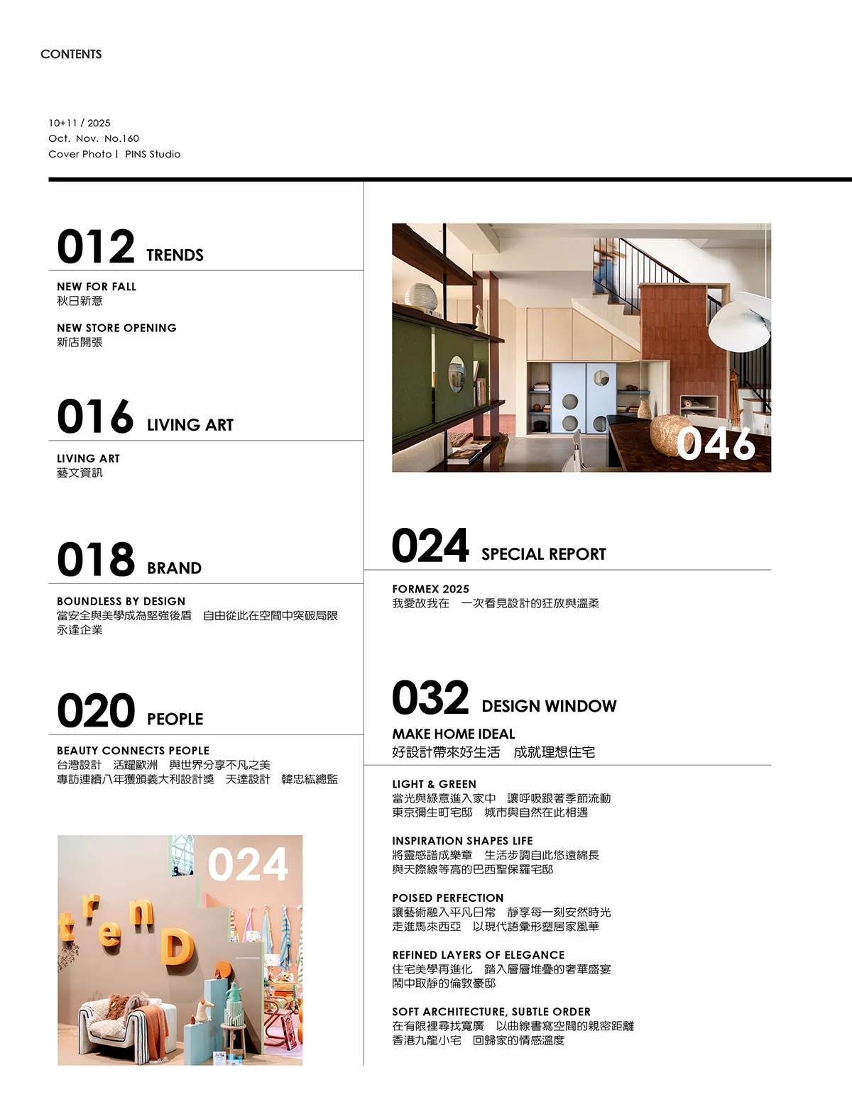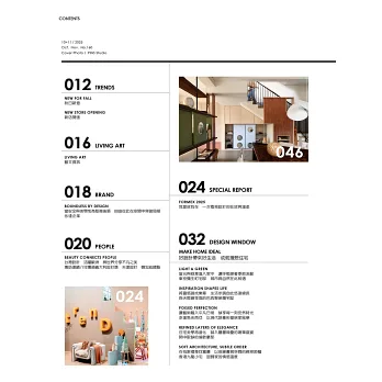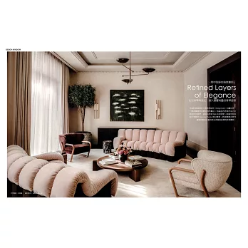 此外,本刊還專訪天達設計與劉品言設計,透過設計師的敘述,讀者能親自見證設計師們在創作過程中的思維轉折與價值堅持。另一方面,編輯還介紹了歐德傢俱與永逢企業,從建材到傢俱,這些品牌在專業與永續之間的努力,為台灣設計奠定更穩固的基礎。當然,雜誌也持續報導台灣本地的優秀住宅設計案例,以回應大家最熟悉的生活樣貌,展現設計如何與日常貼合,並由此滋養出專屬於這片土地的美感。