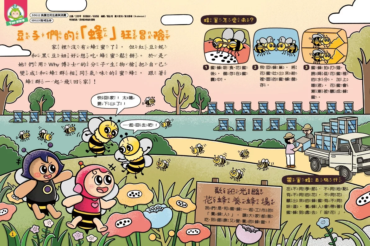 在酸酸的水果添一點蜂蜜,或是在香香的鬆餅淋一點蜂蜜,都能讓食物吃起來更有層次,增添了不一樣的風味。不過,想要吃到蜂蜜可不容易,即使是一小匙的蜂蜜,可都是蜜蜂辛勤工作好長一段時間才得到的呢!這一期的「Top新鮮事」,就讓縮小變身成蜜蜂的紅豆妮和黑豆妞,帶領大家一起去蜂巢裡冒險。你會發現蜂巢裡的蜜蜂們有階級制度,牠們各司其職的辛勤工作,還要隨時進入戰鬥狀態,抵禦外敵,才能平安順利的製造出品質優良的蜂蜜。閱讀完單元,你可以趁著即將來臨的暑假,請大人帶著你去養蜂場觀察養蜂人是如何照顧蜜蜂的,他們帶著住著蜜蜂的蜂箱跑遍全臺灣,只為了把握不同花朵的開花期,讓蜜蜂吃到不同種類的花蜜。百花蜜、龍眼蜜、荔枝蜜……它們各是蜜蜂吃下哪些花朵的花蜜而製造的蜂蜜呢?有機會都去品嘗看看吧!