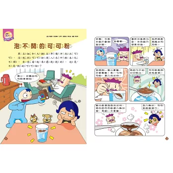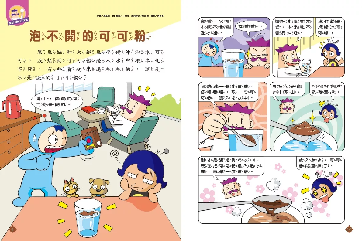 P.9問問WHY博士---泡不開的可可粉----黑豆妞和大鋼豆正在沖泡冰可可,但是可可粉浸入水中根本化不開,有些看起來還乾乾的。