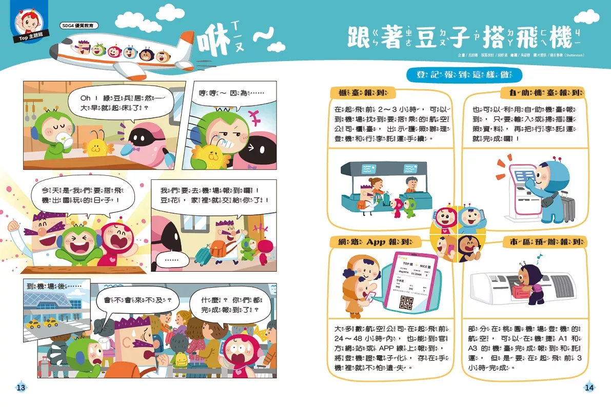 寒假開始了,小讀者們是不是已經迫不及待想出門玩了呢?不管是出遊踏青,還是出國旅遊,一定都對這個假期充滿期待吧!有些家庭也會趁著寒假安排出國旅行,因此這一期的「Top主題館」,就跟著豆子們一起搭飛機吧!從機場報到、安檢,到登機與機上安全的小細節,透過閱讀與遊戲一步步認識,讓大家在真的走進機場時,就能多一分安心,少一點慌張。