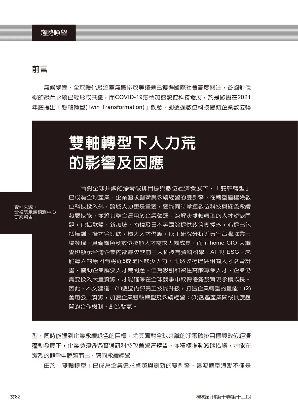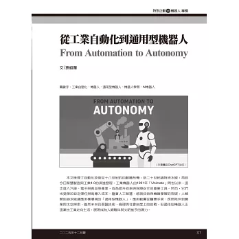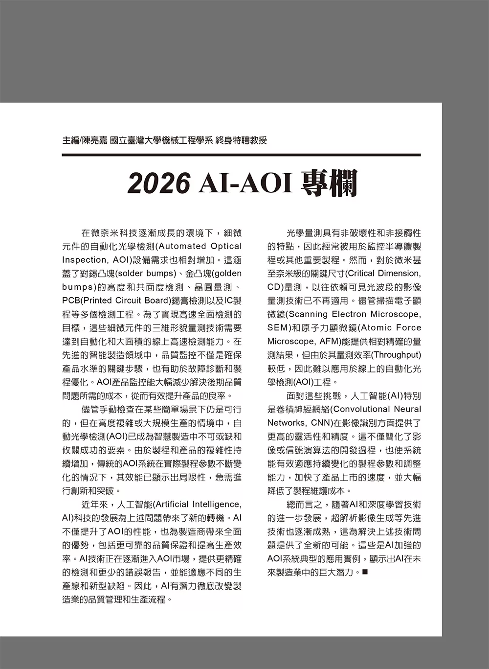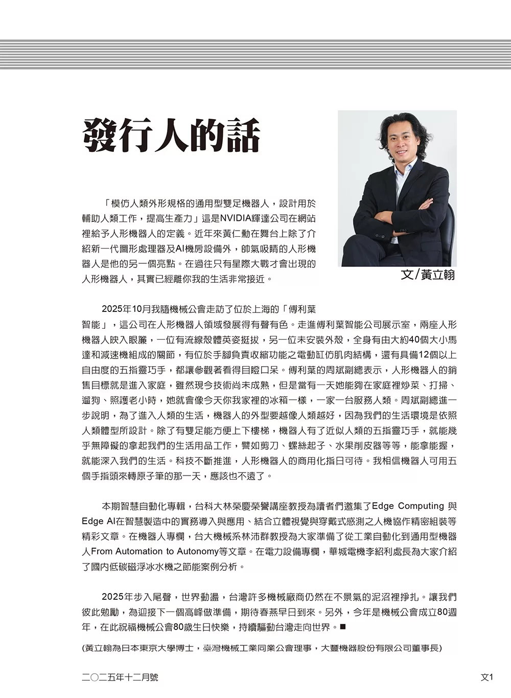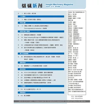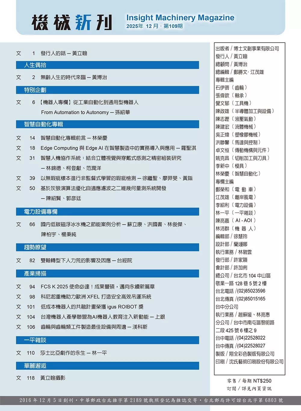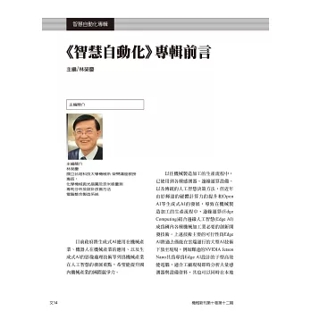 本期智慧自動化專輯,台科大林榮慶榮譽講座教授為讀者們邀集了Edge Computing 與Edge AI在智慧製造中的實務導入與應用、結合立體視覺與穿戴式感測之人機協作精密組裝等精彩文章。在機器人專欄,台大機械系林沛群教授為大家準備了從工業自動化到通用型機器人From Automation to Autonomy等文章。在電力設備專欄,華城電機李紹利處長為大家介紹了國內低碳磁浮冰水機之節能案例分析。