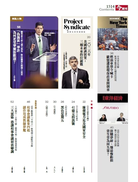 國際投資大師吉姆?羅傑斯(Jim Rogers)、末日博士魯比尼(Nouriel Roubini)、日圓先生神原英資、諾貝爾經濟學獎得主-菲爾普斯(Edmund S. Phelps)、亞洲經濟學家陶冬、中國經濟學者胡祖六…都曾應《今周刊》邀請赴台演講,開展台灣讀者的國際視野。