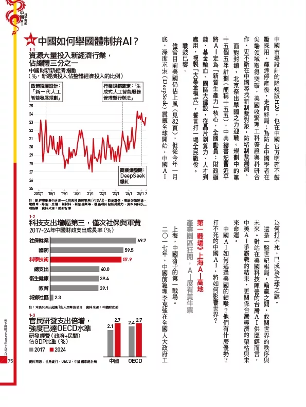 自一月底DeepSeek橫空出世,震撼全球起,中國AI打不死,已成為世界謎團。先進晶片禁運、無數科技公司被美國列為黑名單,竟然沒用。龐大的內需人口,全球第二大經濟體的百工百業,加上高效調動資源的舉國體制,科技巨頭競爭激烈,反而成就打不死的中國AI。(見72頁)