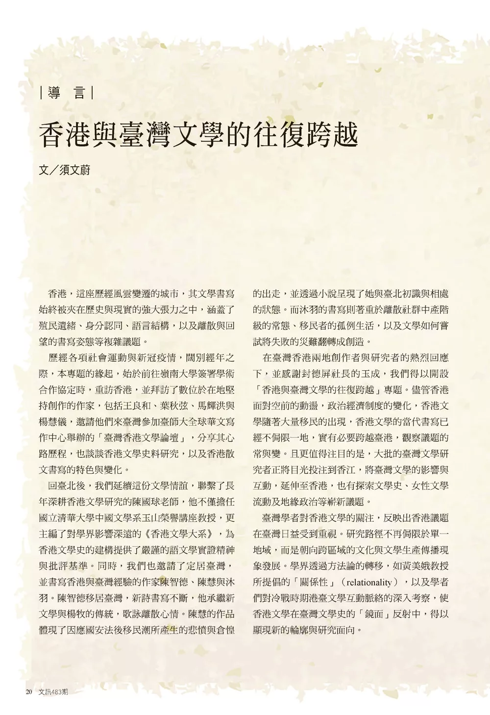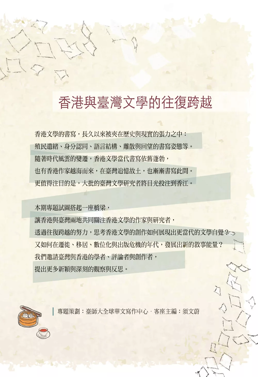 黃美娥與王鈺婷自教研經驗出發,開啟港臺文學以至於女性文學之間的關係性/跨域連結的路徑。港臺文學研究的並行,也體現在文學工作者阿修嗜好藏書與參與策展的契機;臺灣年輕世代研究者陳筱筠回溯一九八○年代的香港文藝刊物,顏訥著眼於冷戰時期迄今的文化混雜歷程,陳昱文自創作者的交流,捕捉詩語言的共振,周子謙以鏡面喻示港臺文學現象與敘事語境的共時性,李筱涵則總結了香港文學研究的跨域趨勢。如此,完成了客座主編須文蔚教授意欲透過多元論述的交會,呈顯「香港與臺灣文學的往復跨越」的動態結構。