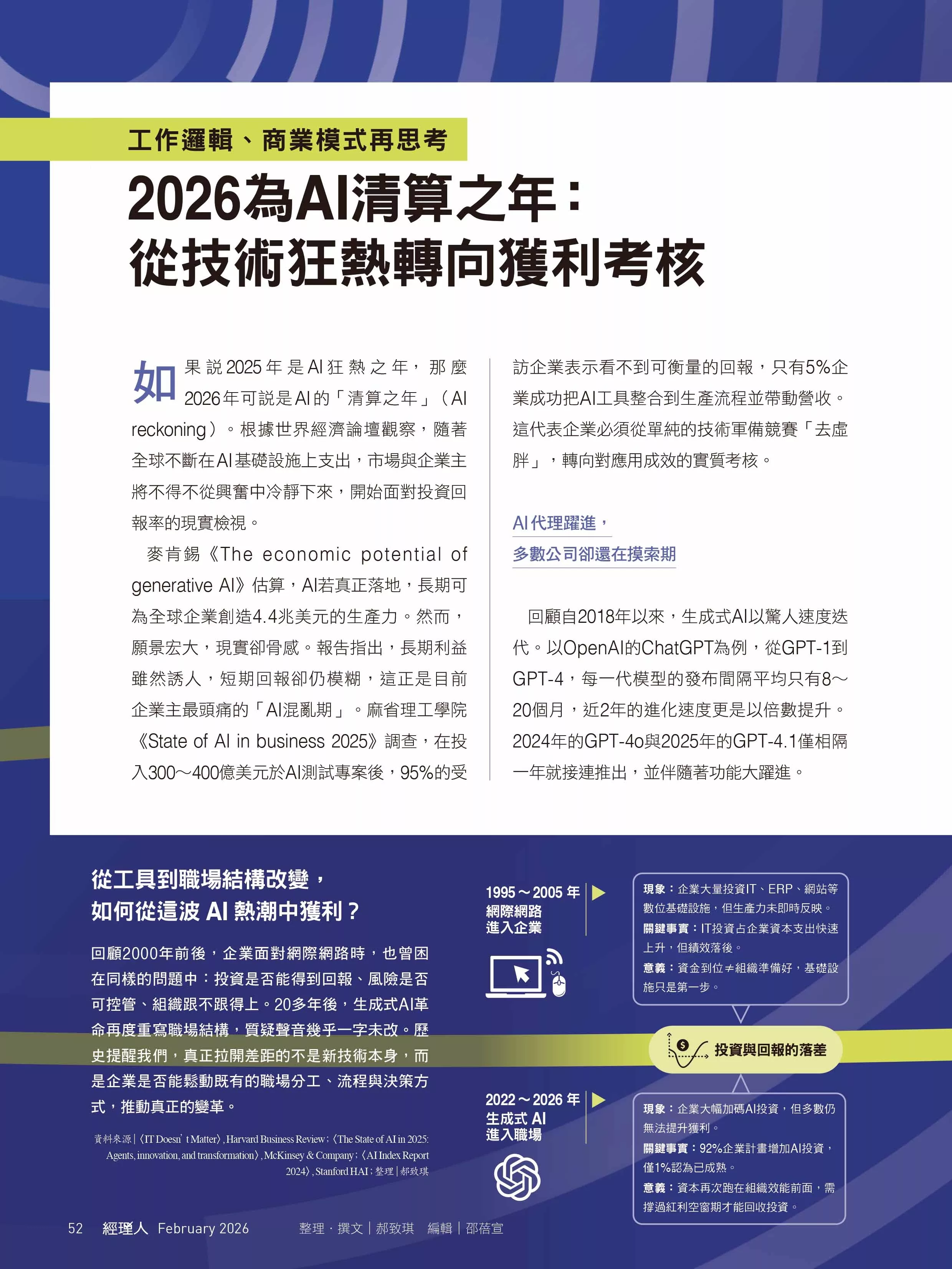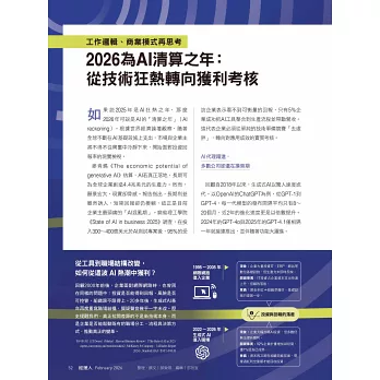 這都還只是從極其簡化的個人層面來看,如果再加上無數個個人、組織、政府的AI投入與投資,變數更多。托馬斯.達文波特(Thomas Davenport)與藍迪.比恩(Randy Bean)在《MIT史隆管理評論》(MIT SMR)一篇專欄裡指出,「如果說2025年是意識到生成式AI存在『價值實現問題』的一年,2026年將是採取行動解決問題的一年。解決價值問題的一個具體方法,是將生成式AI的應用,『以個人為主』轉向『企業級』。」換句話說,AI幫你的日常工作省了多少時間,你又拿省下來的時間做了什麼,企業很難估量,但如果是將AI用於組織層級的功能別的任務或專案,就是AI降本增效的現實檢驗了。