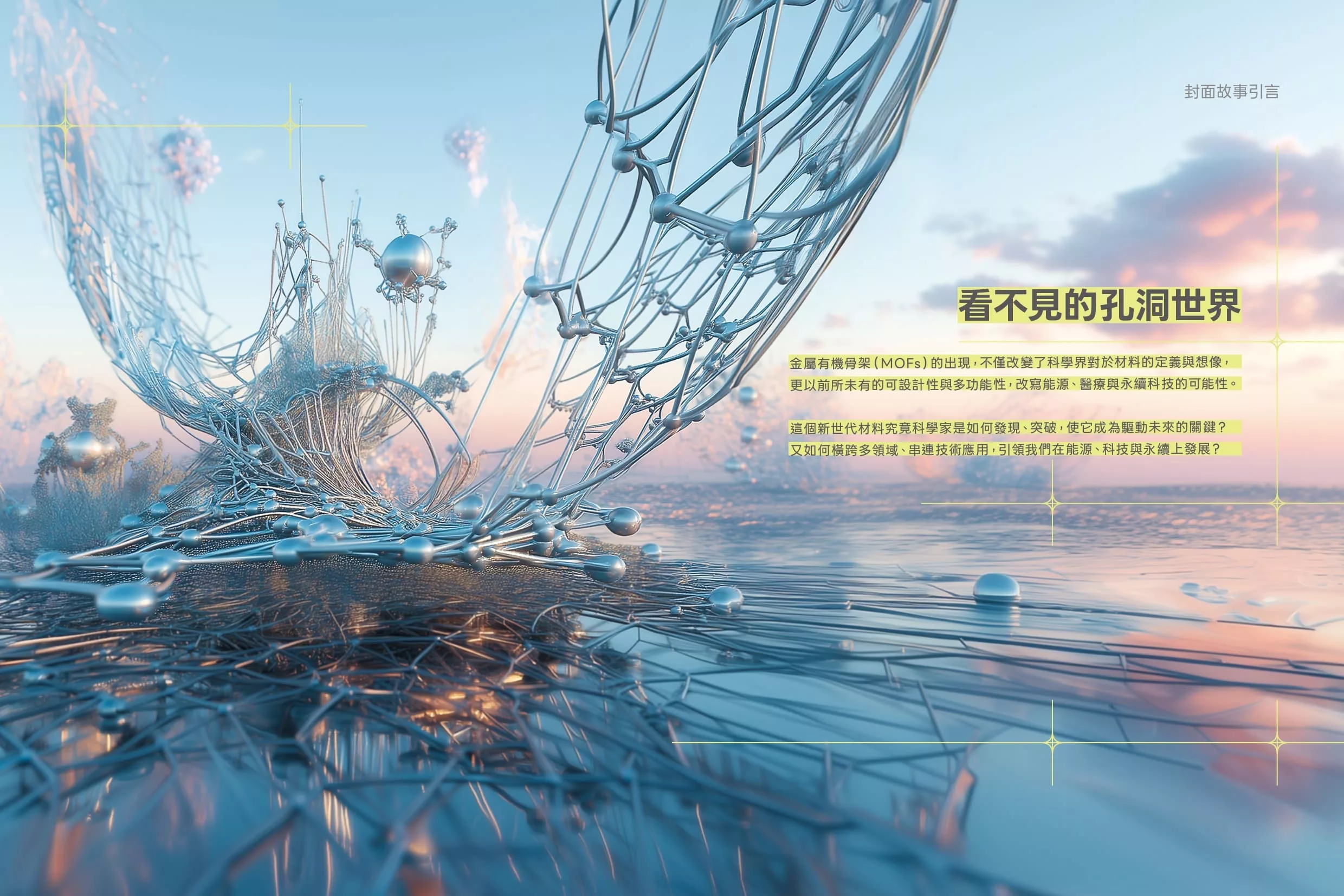 本期封面以 MOFs 家族中具代表性的 ZIF-8 為主題,呈現它獨特的結構。重複的標題文字與背景中的線性元素象徵 MOFs 能以多種方式組合交織,形成密布的網,展現它多元應用與持續發展的可能性。