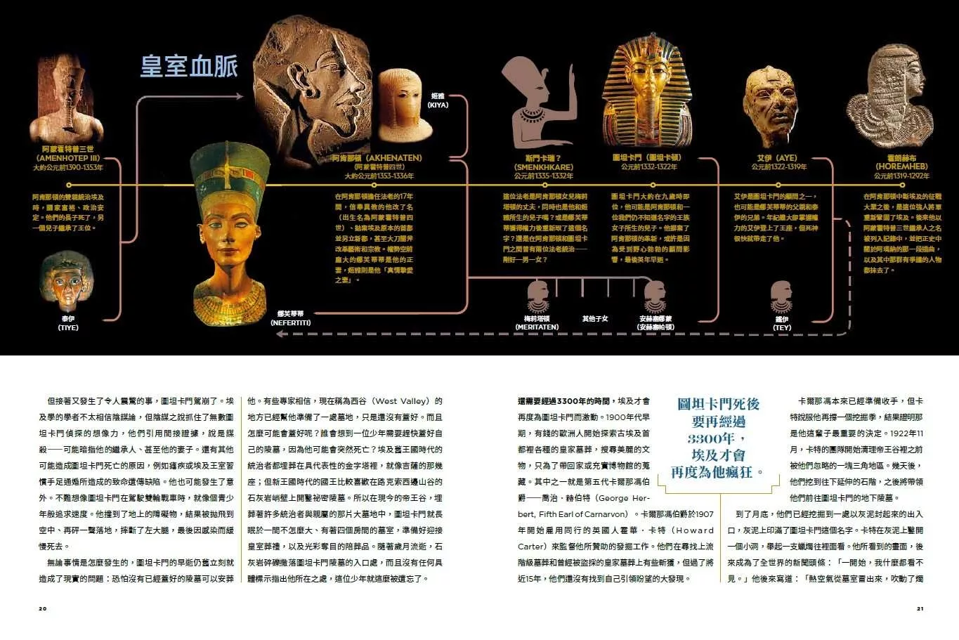 我們今日暱稱為「圖坦卡門」的埃及國王,由於墓中放滿了金銀財寶而聲名大噪,但他其實是形塑古埃及晚期歷史的重要人物。最近有人提出一項新理論,認為埋葬他的陵墓很可能原本屬於他的某一位皇族親戚──甚至可能是美麗的王后娜芙蒂蒂的陵墓──考古學家因此重新使用高科技探索他的墓室,讓世人對這遠古輝煌時代的各種事物再度產生興趣。即使考古學家找到圖坦卡門的安息之地已經將近一個世紀,但這位年輕統治者曲折離奇的生死故事,仍持續吸引世人的關注。