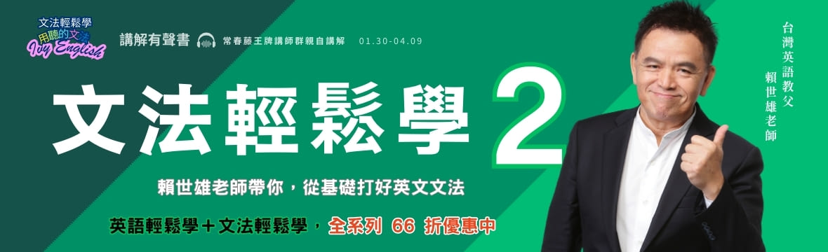 賴世雄老師獨門心法 英文文法有聲書 由「台灣英語教父」賴世雄老師親自講解,聯手 Jennifer 老師,打造最實用的文法入門課。全書共 15 堂課,每堂約 25 分鐘,循序漸進帶你徹底搞懂主詞、名詞、動詞等核心觀念,打好英文基礎,讓文法學習不再卡關! 這是最容易上手、最聽得懂的英文文法有聲書,想學好英文,就從這本開始! *部分內容取自《賴世雄圖解英文法》、《常春藤解析英語雜誌》 本書特色 1. 涵蓋升學與各類英語檢定必備文法重點:全民英檢、多益、雅思、托福通通適用。 2. 由淺入深的講解搭配生活化例句,讓你聽得懂、記得