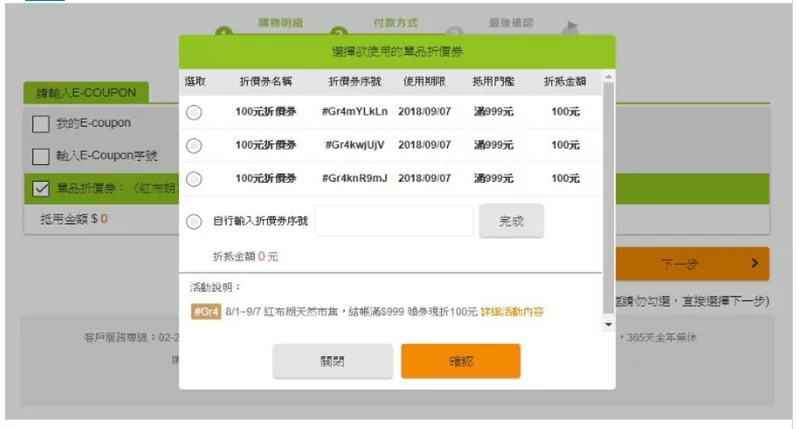 按下一步後,將出現可使用的單品折價券序號之選項,請勾選欲折抵之單品折價券序號即可抵扣。另下方活動說明可查詢相關活動內容。