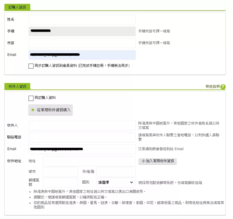 在結帳流程中的「收件人資訊」處,可清除掉系統預設自動帶入的相關資料,再輸入新的收件資料即可。