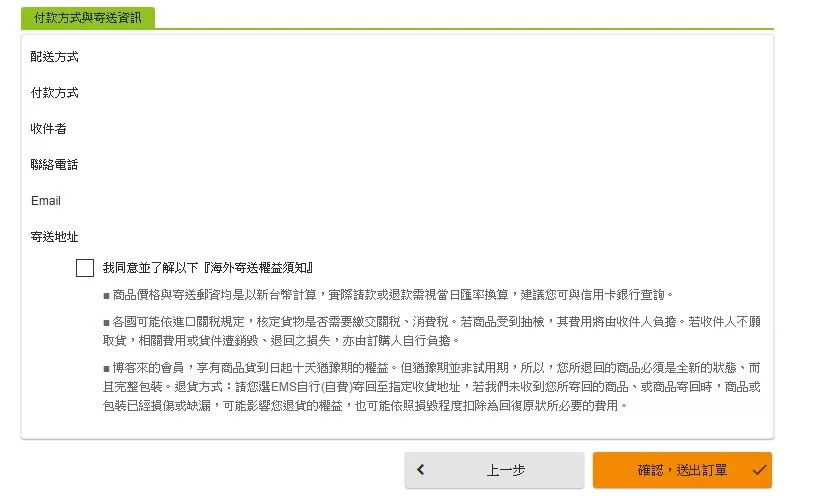 STEP8確認無誤後並勾選『海外寄送權益須知』結帳
