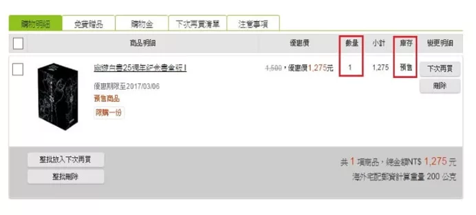 請留意,若您訂購限量商品,則一筆訂單僅可訂購一份。