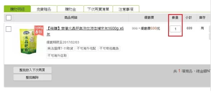 請留意,若您訂購限量商品,則一筆訂單僅可訂購一份。