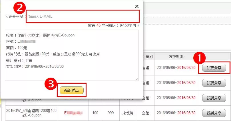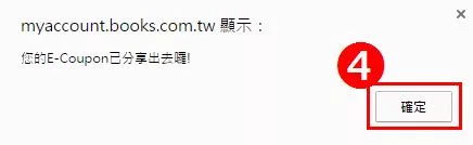 網頁會顯示「您的E-Coupon已分享出去囉!」訊息,按下「確定」後即會依您填寫的E-mail分享完成。