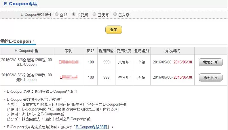 進入E-Coupon專區,可查詢"未使用"、"已使用"、"已分享"的E-Coupon名稱、序號、面額、抵用門檻、使用狀況、適用館別及有效期限。