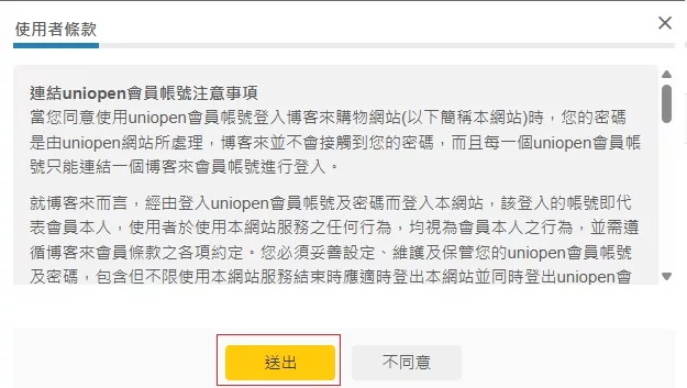 同意「連結綁定uniopen會員帳號使用者條款」 Agree to the "service terms for users who have connected to uniopen" account