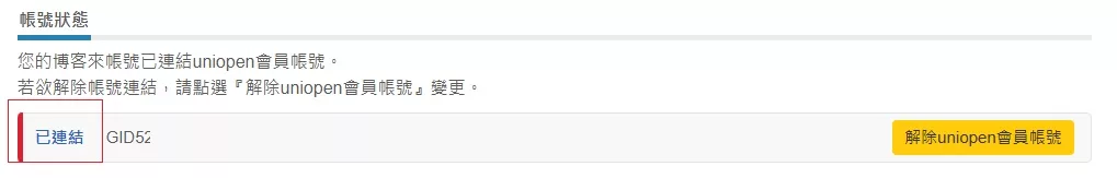 當會員專區顯示為「已連結」且顯示GID號碼,即表示連結uniopen會員帳號成功,您亦可使用uniopen登入博客來網站。