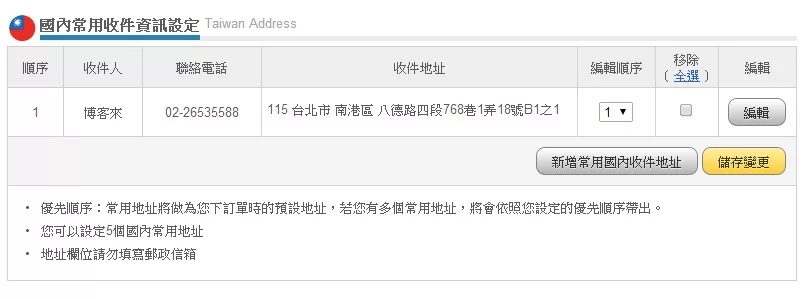 選擇「新增常用國內收件地址」新增選單,最多可加入5個國內常用地址。