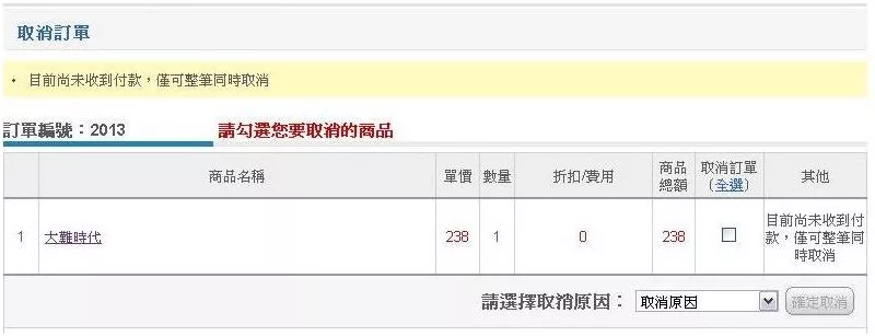 ※系統資料處理完畢後,將依據您訂單狀態,發函通知訂單是否有取消成功。
