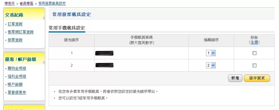 我們提供會員儲存手機載具、自然人憑證、愛心碼各三組,方便您於結帳流程中選用,若要設定常用發票載具,請您至「會員專區」下方「各項設定/維護」中選擇「常用發票載具設定」。